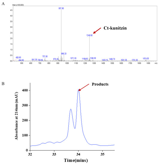 (A) HPLC and (B) mass spectra (ESI-MS) for Ct-kunitzin peptides.
