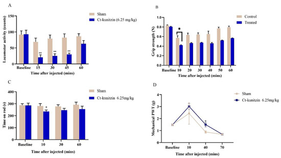 Behavioral changes after Ct-kunitzin injection in mice. (A). Effects of Ct-kunitzin on spontaneous locomotor activity in mice (mean ± SD, n = 6). (B). Grip strength. (C). Rota-rod test. (D). Mechanical PWT. Statistical significance values are indicated as *: p < 0.05, **: p < 0.01.