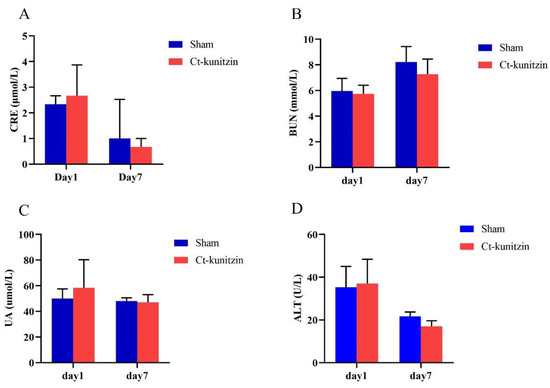 Mice plasma biochemistry on the 7th day after injection of Ct-kunitzin (mean ± SD, n = 6). (A). Serum levels of CRE. (B). Serum levels of BUN. (C). Serum levels of UA. (D). Serum levels of ALT.