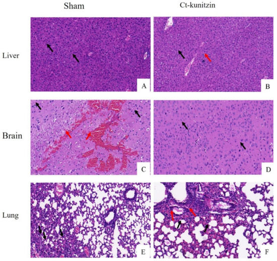The staining results of the brain, liver, and lung tissues of control and experimental mice are shown in Figure 8, showing that when compared with the control group, Ct-kunitzin did not cause pathological changes in the brain, liver, and lung tissues of the mice. No other tissue reaction was observed, which was considered an artifact (black arrow), and no other obvious abnormalities were seen.