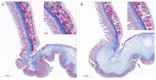 Pathological changes of tube feet tissue of COTS within 1 h of Ct-kunitzin injection. Representative histopathological pictures of the sham control stained by Masson’s Trichrome procedure. (A) Control group injected with saline. (B) Experimental group injected with Ct-kunitzin.