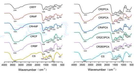 The yields and DS of CRFF, CRMF, CRHMF, CRCF, CRBF, CR2PCA, CR3PCA, CR4PCA, CR2C3PCA and CR2B3PCA are shown in Table 1. Thus indirectly proved the successful synthesis of chitosan derivatives.