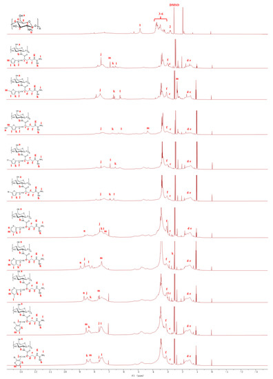 First of all, as shown in Figure 1, we can see from the spectrum of raw material chitosan that the wide association peak near 3300 cm−1 includes O–H and N–H stretching absorption spectrum bands, the sway bending vibration of CH2 at 1411 cm−1, and the C–O stretching vibration of primary alcohol hydroxyl at 1074 cm−1. After the synthesis of ten compounds, it can be seen that the stretching vibration peak of NH2 disappears around 1526 cm−1, and a new wide peak appears around 1640 cm−1, which can be inferred to be the stretching vibration peak of C=N and C=O (amide bond). The stretching vibration peak at 1440 cm−1 is presumed to be CH2 bending vibration in l-arginine [37], the peak around 790 cm−1 is assumed to be the absorption peak of furan ring [38], and 750 cm−1 is attributed to the out-of-plane oscillations of C–H in the pyridine ring. In summary, it can be preliminarily proved that l-arginine Schiff bases combined successfully with chitosan.