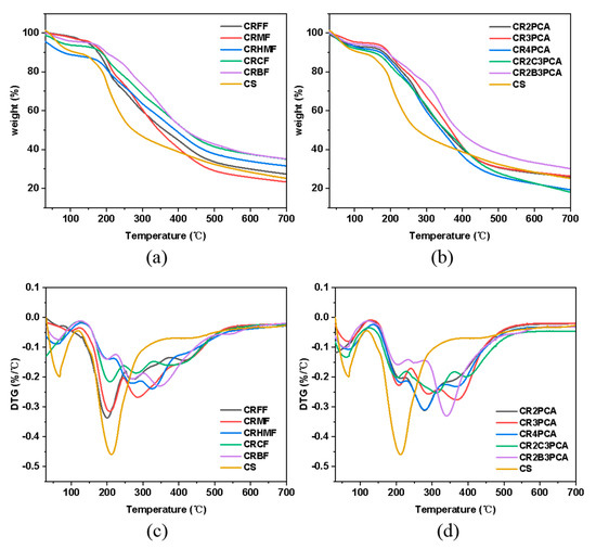Water-absorption and degradation behavior of chitosan and chitosan derivatives can be evaluated by TGA. In Figure 3, chitosan has two stages of weight loss, the first stage is around 30–120 °C with a loss of about 11% by weight for the evaporation of water molecules in chitosan; the second stage starts at 200 °C and reaches around 700 °C with a weight loss of about 74%, which is caused by the breakage and burning of the chitosan molecular chain [43,44]. In this case, chitosan reaches its maximum weight loss at 210 °C with a weight loss of 30.85%, which may be caused by the decomposition of the sugar rings at this point [45]. After modification, the chitosan derivatives have about four stages of weight loss, with a slower decomposition rate and higher thermal stability than chitosan. In the second stage, the maximum decomposition rates of the chitosan derivatives (CRFF, CRMF, CRHMF, CRCF, CRBF, CR2PCA, CR3PCA, CR4PCA, CR2C3PCA, CR2B3PCA) occurred at 198 °C, 207 °C, 199 °C, 210 °C, 201 °C, 207 °C, 206 °C, 208 °C, 203 °C, 201 °C, at which time the mass fractions were: 83.95%, 83.84%, 81.68%, 84.57%, 89.68%, 86.41%, 87.51%, 83.52%, 82.36%, 88.39%, and the weight losses were: 16.05%, 16.16%, 18.32%, 15.43%, 10.32%, 13.59% 12.49%, 16.48%, 17.64%, 11.61%.