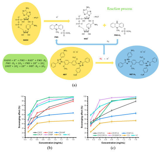 Reaction process of superoxide-radical scavenging activity assay (a), superoxide radical-scavenging capacity of chitosan and chitosan derivatives (b,c).