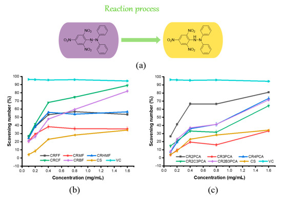 Reaction process of DPPH-radical scavenging ability assay (a), DPPH radical-scavenging capacity of chitosan and chitosan derivatives (b,c).
