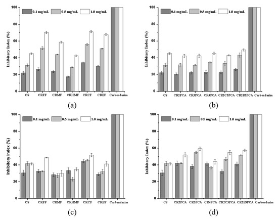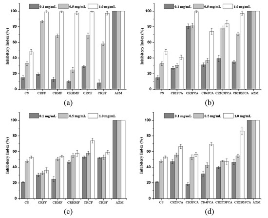 As shown in Figure 7, at the concentration of 1.00 mg/mL, the inhibition rates of CRFF, CRMF, CRHMF, CRCF, CRBF, CR3PCA, and CR2B3PCA against S. aureus were 99.17%, 99.35%, 97.56%, 99.47%, 97.30%, 99.31%, 96.98%, respectively. Gram-negative bacteria and Gram-positive bacteria have different cell wall compositions. Gram-positive bacteria (S. aureus) are composed of multilayer reticular peptidoglycan linked to teichoic acid and have a thicker cell wall. Peptidoglycan is a disaccharide unit containing a tetraceptide side chain, in which the amino acids in the tetraceptide vary by bacterial species. The teichoteic acid main chain is alternately linked by alcohol and phosphoric acid molecules, and the side chain is a single glucose or d-Ala. For Gram-negative bacteria (E. coli), the cell wall is thin and contains a single layer of peptidoglycan covered by an outer lipid membrane. From the experimental results, the sample solution at 0.10 mg/mL of gold glucose-inhibition ability is low, but at a high concentration (1.00 mg/mL) inhibition ability is very strong. Previous studies have speculated that chitosan derivatives form polymer membranes on cell surfaces that block the entry of nutrients [49]. For Gram-negative bacteria (E. coli), there is little difference between 0.50 mg/mL and 1.00 mg/mL in the inhibition ability of bacteria. It is speculated that the free positive charge and guanidine carried by chitosan can combine with the negatively charged components of the cell wall, resulting in the leakage of substances inside the cell holes and disturbing the normal physiological activities of bacteria [50].