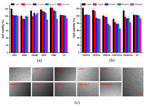 The cytotoxicity profile of chitosan and ten chitosan derivatives was evaluated in vitro by the MTT method, using L929 mice fibroblast cells line (L929, obtained from China Center for Type Culture Collection, Shandong Luye Pharmaceutical Co., Ltd., Yantai, China), which have a high differentiation capacity and ease of culture in vitro. The mechanism of MTT assay is that succinate dehydrogenase in the mitochondria of living cells restore exogenous MTT (3-(4,5-dimethyl-2-thizolyl)-2,5-diphenyltertazolium bromide) into formazan (a purple crystal insoluble in water). DMSO was added to dissolve formazan, and the number of cells was measured by measuring the absorbance of the solution. The cytotoxicity of the samples as shown in Figure 8a,b, it can be seen that CRFF, CRMF, CRHMF, CR2PCA, and CR3PCA were hardly toxic to L929 cells in the concentration range of 1–1000 µg/mL, while CRCF, CRBF, CR4PCA, CR2C3PCA, and CR2B3PCA had some cytotoxicity at 1000 µg/mL. For all samples, within the concentration range of the test sample, the cell viability exceeded 80%, which intuitively indicated low cytotoxicity. The morphology of the cells can be seen in Figure 8c. The normal cell morphology is spindle-shaped and adheres well to the cell wall, while the sample is toxic, the cells have a rounded morphology and no longer adhere to the cell wall. In conclusion, the non-toxicity of the chitosan derivatives was initially confirmed by the L929 cytotoxicity test and further experimental studies will be conducted if practical applications are considered.