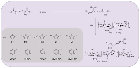 Chitosan with a molecular weight of 8 kDa and 93% N-deacetylation was purchased from Golden-Shell Pharmaceutical Co., Ltd. (Zhejiang, China). l-Arginine and methanol were purchased from Sinopharm Chemical Reagent Co., Ltd., Shanghai, China. Furfural, 5-methylfurfural, 5-hydroxymethylfurfural, 5-chloro-furfural, 5-bromo-furfural, 2-pyridinecarboxaldehyde, 3-pyridinecarboxaldehyde, 4-pyridinecarboxaldehyde, 2-chloro-3-pyridinecarboxaldehyde, 2-bromo-3-pyridinecarboxaldehyde, 1,1′-carbonyldiimidazole (CDI) and dimethyl sulfoxide (DMSO) were purchased from Merck Life Science (Shanghai) Co., Ltd., Shanghai, China. Ethanol absolute was obtained from Fuyu Fine Chemicals Co., Ltd., Tianjin, China. Chloramphenicol and azithromycin were purchased from Aladdin Biochemical Technology Co., Ltd., Shanghai, China. Purified water was supplied by Wahaha Group Co., Ltd., Shandong, China.