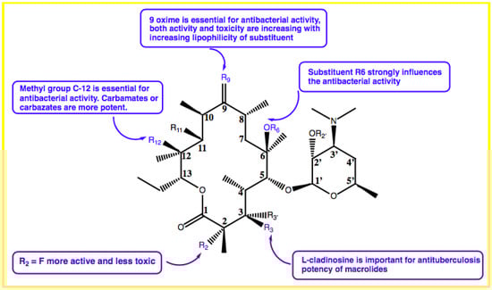 Zhu et al. found that the appropriate substitutions on the C-9, C-11, C-12, or C6 positions in the macrolactone ring have good activity against M. tuberculosis. This group also showed that L-cladinosine located in the C-3 position is critical for macrolides in exerting their anti-mycobacterial activities (Figure 2) [].