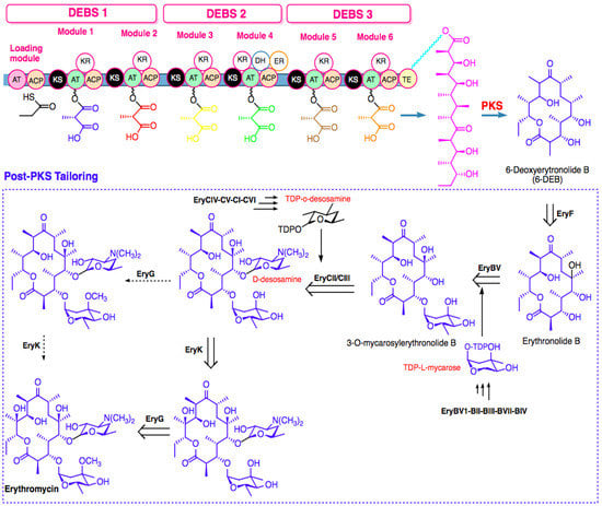 Biosynthesis of macrolides utilizing modular type I PKSs are usually bounded in scope and utility due to the limited substrate specificity of the polyketide biosynthetic machinery []. Recent information on the protein structure of enzymes and the advanced technique of genetic manipulation presents an immense opportunity for fine-tuning the step of post-PKS to yield structurally diversified or novel macrolides []. The diverse modularity in the genetic architecture of PKSs presents sufficient reason for expecting feasibility for engineering the enzymes to obtain new drug candidates by combinatorial biosynthesis [,].