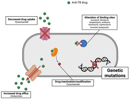 A deeper understanding of the mechanism of resistance in M. tuberculosis strains is imperative to aid the development of new drugs and the detection of resistance levels in patients. Early detection is very important to ensure better disease management and spread prevention. Principally, M. tuberculosis resistance is acquired through mutations in genes that play a role in the expression of drug targets []. Patients can become infected with resistant TB through two scenarios. First, the host becomes infected with resistant strains, resulting in primary-drug resistance. Second, resistance develops during disease progression due to the emergence of new mutations, also known as secondary-drug resistance [,]. Furthermore, the mechanisms of resistance of M. tuberculosis to particular anti-TB drugs are discussed in the following sections and summarized in Figure 4.
