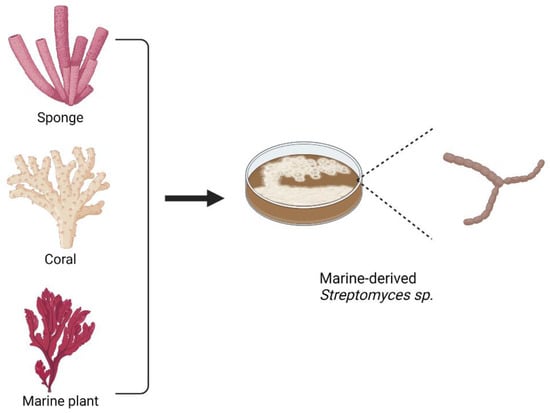 From the list, marine Streptomyces sp. becomes the major source for marine macrolides. In addition, marine microorganisms residing in corals, sponges, or other marine plants also have the potential to be the sources for isolating antibiotics. Figure 7 shows several marine organisms that have become the main sources for isolating marine microorganisms, including Streptomyces sp., that are associated with the production of macrolides.