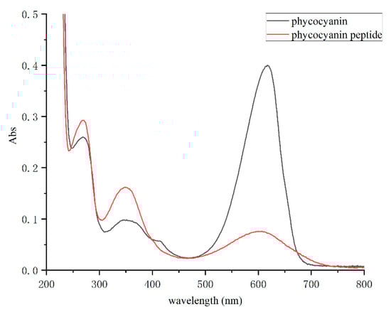 By configuring the Spirulina PC and phycocyanin peptide into a same-concentration solution and scanning in the full wavelength range of 200–800 nm, the absorption spectrum of the phycocyanin peptide was obtained (Figure 2). The absorption peaks of PC distributed mostly at 620 nm (chromophore absorption) and 280 nm (aromatic amino acid absorption), and another peak at 360 nm reflects the PCB conjugate. In the full-wavelength scan, it was shown that the absorbance peak of phycocyanin peptide at 620 nm decreased obviously, while those at 280 nm and 360 nm increased. The properties of the absorption spectrum are very similar to that of the PCB standard. Therefore, it shows that the PC had been fully decomposed into phycocyanin peptides, and the enzymatic hydrolysis was sufficient.