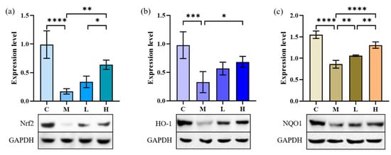 The effect of phycocyanin peptides on the expression of Nrf2, HO-1, and NQO1 in A549 cells induced by TGF-β1: (a) Nrf2 expression; (b) HO-1 expression; (c) NQO1 expression. C: the control group; M: the model group; L: the low-dose group (10 μg/mL); H: the high dose group (30 μg/mL). n = 3, mean ± SD. * p < 0.05; ** p < 0.01; *** p < 0.001; **** p < 0.0001.