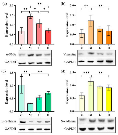 The effect of phycocyanin peptides on the expression of EMT-related proteins in A549 cells induced by TGF-β1: (a) α-SMA expression; (b) Vimentin expression; (c) N-cadherin expression; (d) E-cadherin expression. C: the control group; M: the model group; L: the low-dose group (10 μg/mL); H: the high dose group (30 μg/mL). n = 3, mean ± SD. * p < 0.05; ** p < 0.01; *** p < 0.001.
