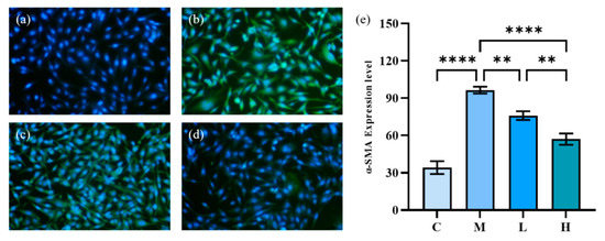 The effect of phycocyanin peptides on the expression of α-SMA in HFL-1 cells induced by TGF-β1: (a) the control; (b) the model; (c) low-dose at 10 μg/mL; (d) high-dose at 30 μg/mL (e) α-SMA expression level. C: the control group; M: the model group; L: the low-dose group (10 μg/mL); H: the high dose group (30 μg/mL). n = 3, mean ± SD. ** p < 0.01; **** p < 0.0001.