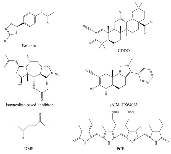 Britanin, CDDO, isoxazoline-based_inhibitor, DMF, and sAIM_TX64063 are all known small molecule inhibitors of the Keap1 BTB domain. Although the mechanisms of action of these small-molecule inhibitors vary, they can be grouped largely into three categories: (1) isoxazoline-based_inhibitor and DMF using α, β-unsaturated carbonyl groups as electrophilic receptors, (2) triterpenoids (CDDO and sAIM_Tx64063) taking nitrile group as electrophilic receptor, and (3) Britanin that uses a halogen as a reactive group and can suppress Keap1 activity by creating a covalent bond with the sulfur atom in Cys151 of the Keap1 BTB domain (Figure 9). PCB has α, β-unsaturated carbonyl groups, so we thought that PCB might also be able to inhibit the activity of Keap1 through the Michael addition reaction. DMF is considered to protect mouse neurons and astrocytes from oxidative stress; this process is thought to occur as DMF interacts with the Keap1 BTB domain to activate Nrf2 transcription, which in turn mediates the cellular antioxidant activity process [34]. Britanin is an herbal derivative that is thought to be capable of reversing hypoxia-glucose deprivation by inhibiting Keap1 [35]. As a triterpenoid, CDDO is thought to be a good inhibitor of various inflammatory diseases such as emphysema and COPD [36]. Isoxazoline-based–inhibitor is isoxazolinyl electrophile capable of reacting with cysteine residues, which has been used in the design of different covalent inhibitors [37]. Similar in structure to CDDO, sAIM_TX64063 is also a triterpenoid and has been demonstrated having an excellent activation effect on Nrf2, and this activity is also associated with the inhibition of Keap1 [38]. Therefore, these five small molecule compounds and PCB were selected for covalent docking simulations, and the possible anti-inflammatory and anti-fibrotic mechanisms of PCB were discussed by comparing the results after covalent docking.