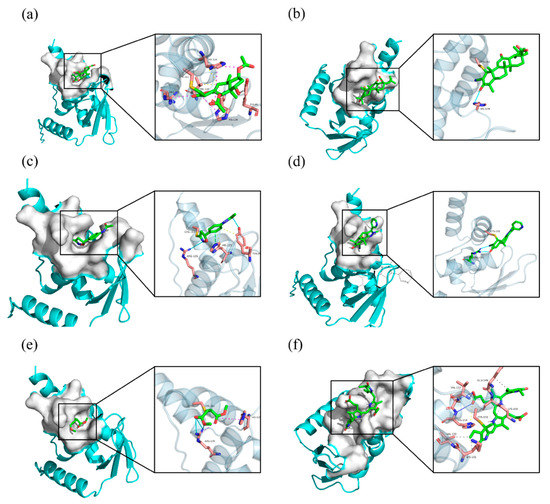 Small-molecule inhibitors covalent docking to the Keap1 BTB domain: (a) Britanin; (b) CDDO; (c) Isoxazoline-based–inhibitor; (d) sAIM_TX64063; (e) DMF; (f) PCB. The yellow dashed lines are hydrophobic interactions, the magenta dashed lines are salt bridges, the cyan solid lines are hydrogen bonds, and the green dashed lines are π-stacking.