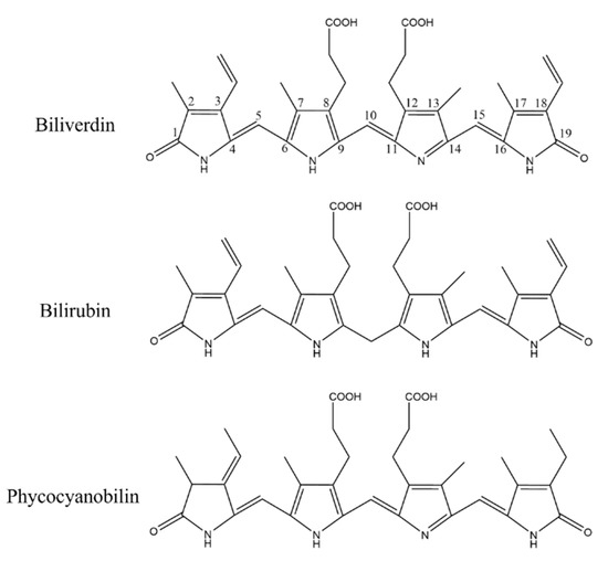 Structure comparison of biliverdin, bilirubin, and phycocyanobilin.