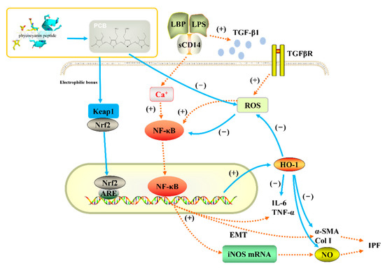 Based on published scientific research, we believe that the antioxidant, anti-inflammatory, and anti-pulmonary fibrosis activities of phycocyanin peptides are related to the structure of the PCB bound in the phycocyanin peptide. As shown in Figure 11, PCB and bilirubin are only slightly different on the substituents of C3, C10, and C18. Therefore, PCB may have a similar effect on bilirubin in vivo, and the phycocyanin peptide could be quickly absorbed in the gastrointestinal tract because of its small molecular weight, after entering the body. The PCB bound in the phycocyanin peptide has a linear tetrapyrrole structure. They are polypeptides, and the resulting steric hindrance prevents the formation of internal hydrogen bonds between the propionic acid group and carbonyl group, which could increase the water solubility of PCB. After being absorbed by cells, the α, β-unsaturated carbonyl group on PCB act as electrophiles to bind the thiol of the cysteine residue in Keap1, release and activate Nrf2, transfer it to the nucleus, bind with ARE, and further activate the HO-1 gene. The activated HO-1 gene expresses HO-1, regulates immune cells [45], and inhibits the expression of inflammatory pathway NF-κB, which is under a direct anti-inflammatory effect (Figure 12). In addition, elevated HO-1 has antioxidant effects to eliminate ROS together with a direct antioxidant effect of the phycocyanin peptide to reduce oxidative stress damage in the tissue.