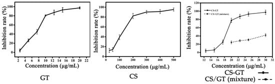 Figure 1. Inhibition rate of V. parahaemolyticus for GT, CS, CS-GT and the mixture of CS and GT (Note: Inhibition rate of the mixture of CS and GT was simulated by the real content of CS and GT in CS-GT determined by the inhibition rate curves of CS and GT. In addition, CS and GT are beyond the range of inhibition rate curve when the concentration of CS-GT is lower than 20.00 μg/mL, which was not represented here. x ¯   ±   SD ,   n   =   3 ) .