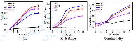 Figure 2. The OD260, K+ leakage and conductivity of V. parahaemolyticus dealing with CS, GT and CS-GT ( x   ¯   ±   SD ,   n   =   3 ).
