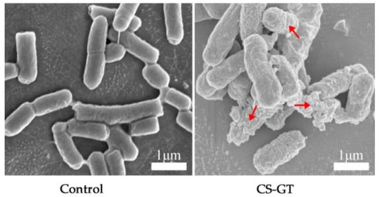 Furthermore, morphological changes of bacteria were observed by SEM. The somatic cells of untreated V. parahaemolyticus were rod-shaped with an intact cell membrane and smooth cell outline (Figure 3). Conversely, significant morphology changes were observed for V. parahaemolyticus after being treated with GT-CS (Figure 3); the cell membranes were adhered and wrinkled, and the intracellular contents had leaked. The cell wall disruption may be directly related to the binding between GT-CS and proteins of the bacterial outer membrane through electrostatic interactions and hydrogen bonding [10]. The results were consistent with all the above experiments on the integrity of the cell structure. Briefly, the antibacterial activity of CS-GT on V. parahaemolyticus was significantly improved after CS was grafted with GT, which possessed an amount of amino groups. This is due to the positively charged ammonium groups of CS-GT increasing the electrostatic interaction with the cell membrane, resulting in the destruction of the cell membrane, the leakage of electrolytes (such as K+, Na+ and H+) and macromolecules (DNA and RNA) inside the cell, and finally the cell death.