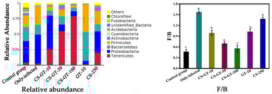 In this work, it was found that CS-GT had a great effect on the intestinal microbiota of V. parahaemolyticus-infected Litopenaeus vannamei, which was owing to the strong anti-V. parahaemolytic activity. Proteobacteria, including many pathogens such as Aeromonas and Vibrio, is common and abundant in the sea [29]. However, increased abundance of Proteobacteria is a signature of intestinal epithelial dysfunction [30]. As displayed in Figure 5, the abundance of Proteobacteria in the only-infected group was highest (p < 0.05), which was related to the Litopenaeus vannamei infected with V. parahaemolytic belonging to Proteobacteria at phylum level. The result indicated that infection with V. parahaemolyticus might induce gut dysbiosis of Litopenaeus vannamei. The abundance of Proteobacteria in the CS-GT-10 group was also significantly higher (p < 0.05), which indicated that a low dose of CS-GT cannot prevent the invasion and colonization of V. parahaemolyticus and alleviate the intestinal dysfunction. However, the abundance of Proteobacteria in the CS-GT-50, CS-GT-100 and GT-10 groups was significantly lower (p < 0.05), displaying that GT and CS-GT with medium and high doses can reduce intestinal dysfunction, which was consistent with the analysis of intestinal histopathology.