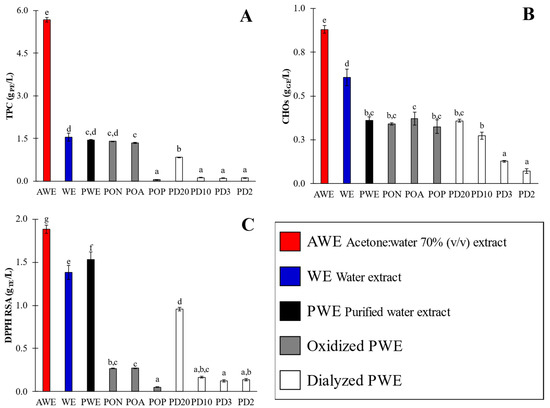 Phytochemical and antioxidant activity (TPC (A), CHOs (B) and DPPH RSA (C)) of crude (AWE and WE), purified (PWE), oxidized (PON, POA and POP) and dialyzed (PD20, PD10, PD3 and PD2) extracts. Different superscript letters indicate significant (p < 0.05) differences among values. Error bars correspond to standard deviations of measures.
