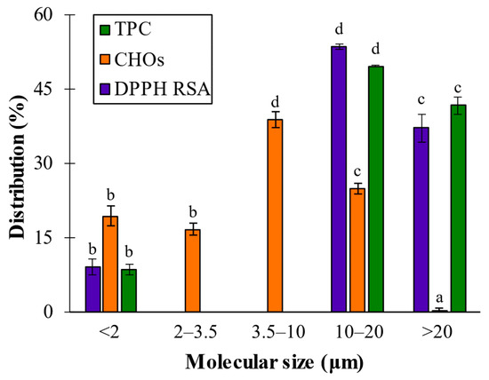 Distribution percentage of TPC, CHO and DPPH RSA values among dialyzed extracts. Different letters above bars mean that average values are significantly different (p > 0.95).