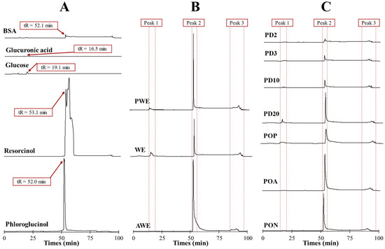 RP-HPLC–UV profiles (266 nm) of (A) standard compounds (phloroglucinol, resorcinol, glucose, glucuronic acid and BSA); (B) crude and purified (AWE, WE and PWE), (C) oxidized, (PON, POA and POP) and dialyzed (PD20, PD10, PD3 and PD2) extracts.