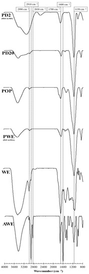 The FTIR technique was used to appreciate the notorious differences among assayed extracts, such as the number of peaks (due to chemical reactions), peak intensities (differences in compounds content) and peak shapes (presence of similar groups). The FTIR spectra for crude (AWE and WE), purified (PWE), oxidized (POP) and dialyzed (PD20 and PD2) extracts are shown in Figure 5. Oxidized POA and PON did not show significant differences with PWE, and dialyzed samples PD10 and PD3 showed similar spectra to PD2.