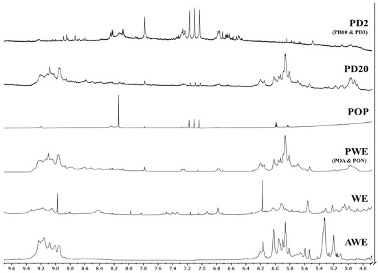 An 1H-NMR analysis was carried out to give a proximate insight into the chemical structure of the crude (AWE and WE), purified (PWE), oxidized (POP) and dialyzed (PD20 and PD2) extracts. No significant differences were observed between POA and PON, with PWE and between PD10 and PD3 with PD2, similar to the results of FTIR spectroscopy. The 1H-NMR spectra of these samples showed noticeable signals in the range of 4.8–9.6 ppm (Figure 6), where the main polyphenolic compounds could be identified together [5,9,34,35].
