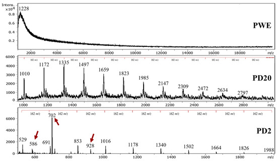 MALDI–TOF-MS spectra of purified (PWE) and dialyzed extracts (PD20 and PD2).