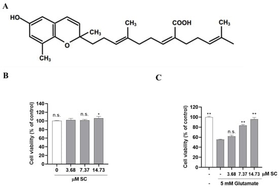 SC prevents glutamate-induced toxicity in HT22 cells. (A) Chemical structure of SC. (B) HT22 cells were incubated with the indicated concentrations of SC for 24 h. The statistical symbols (* p < 0.05; n.s., no significance) indicate significant differences from the 3.68 μM SC-treated group. (C) HT22 cells were incubated with or without indicated concentration of SC for 1 h, and then further incubated with 5 mM glutamate for 24 h. Cell viability was measured by MTT assay. Experiments were performed in triplicate. The statistical symbols (* p < 0.05; ** p < 0.01; n.s., no significance) indicate significant differences from the glutamate-treated group.