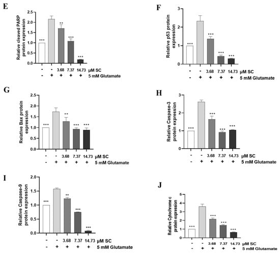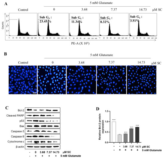 In order to confirm whether SC showed cytoprotective effects against glutamate-induced cell death, we examined the production of sub-G1 DNA contents, nuclear condensation/fragmentation, and expression of apoptosis-related proteins expression []. Thus, we first checked the DNA content using flow cytometry. As shown in Figure 2A, compared with the non-treated control cells (1.21%), the glutamate-treated cells significantly induced the sub-G1 population (23.45%), whereas the pretreatment of SC prior to glutamate’s addition decreased the sub-G1 population up to 3.51% at 14.76 µM per dose. Next, we confirmed the morphological changes, as shown in Figure 2B, caused by glutamate. The nuclear staining in Figure 2B indicated that the glutamate-treated cells exhibited a greater degree of fragmentation and nuclear condensation, which are characteristics of apoptosis, compared to the non-treated cells (control). However, these processes were effectively reduced by the pretreatment with SC (Figure 2B). Further, we checked the expression levels of apoptosis-mediated proteins. The SC pretreatment markedly increased the expression of Bcl-2 protein that was decreased by glutamate (Figure 2C,D). In contrast, the expression levels of pro-apoptotic proteins (Bax, p53, and cleaved-PARP) increased by glutamate were down-regulated by the pretreatment of SC (Figure 2C,E–G). Moreover, the pretreatment with SC decreased the expression levels of the apoptosis sub-molecules, caspase-3 and caspase-9 (Figure 2C,H,I), and finally inhibited the expression of cytochrome c (Figure 2C,J), suggesting that SC protects HT22 cells against glutamate by inhibiting apoptosis.