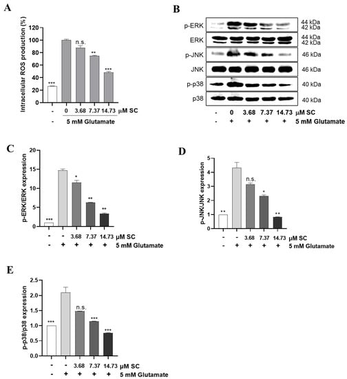 SC reduces the intracellular ROS production and inactivates the MAPKs in glutamate-treated HT22 cells. The cells were incubated with or without indicated concentration of SC for 1 h, and then further incubated with 5 mM glutamate for 12 h. (A) Effect of SC on intracellular ROS production. (B–E) Effect of SC on protein expression of MAPKs. The statistical symbols (* p < 0.05; ** p < 0.01; *** p < 0.001; n.s., no significance) indicate significant differences from the glutamate-treated group.