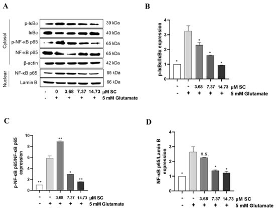 SC inhibits the activation of NF-κB signaling pathway in glutamate-treated HT22 cells. HT22 cells were incubated with various doses of SC for 1 h, and then further incubated with 5 mM glutamate for 1 h. The expression levels of proteins involved in NF-κB signaling pathway such as IκBα (A,B), cytoplasmic NF-κB p65 (A,C), and nuclear NF-κB p65 (A,D) were detected by Western blot assay. The statistical symbols (* p < 0.05; ** p < 0.01; n.s., no significance) indicate significant differences from the glutamate-treated group.