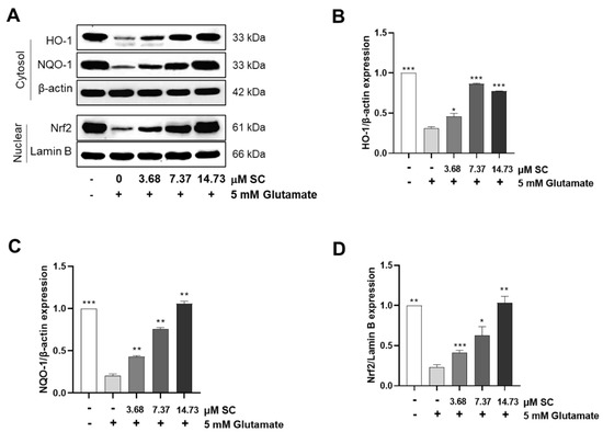 SC activates Nrf2/HO-1 signaling pathway in glutamate-treated HT22 cells. The cells were incubated with various doses of SC for 1 h, and then further incubated with 5 mM glutamate for 12 h. The expression levels of proteins involved in Nrf2/HO-1 signaling pathway such as HO-1 (A,B), cytoplasmic NQO-1 (A,C), and Nrf2 (A,D) were detected by Western blot assay. The statistical symbols (* p < 0.05; ** p < 0.01; *** p < 0.001) indicate significant differences from the glutamate-treated group.