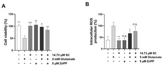 Effect of HO-1 inhibitor ZnPP on cell viability and intracellular ROS levels in SC-pretreated HT22 cells under glutamate treatment. The HT22 cells were incubated with 5 μM ZnPP for 1 h with or without SC (14.73 µM) followed by 5 mM glutamate treatment for 1 h. Then, cell viability (A) was determined with MTT assay and intracellular ROS levels (B) were measured by DCFH-DA assays 24 h after exposure to glutamate. The value of cell viability was set to 100% for the non-treated control cells, and the intracellular degree of ROS production was set to 100% for the glutamate-treated cells. Values are expressed as the mean ± SE calculated from three replicates. The statistical symbols (* p < 0.05; ** p < 0.01; *** p < 0.001; n.s., no significance) indicate significant differences from the glutamate-treated group.