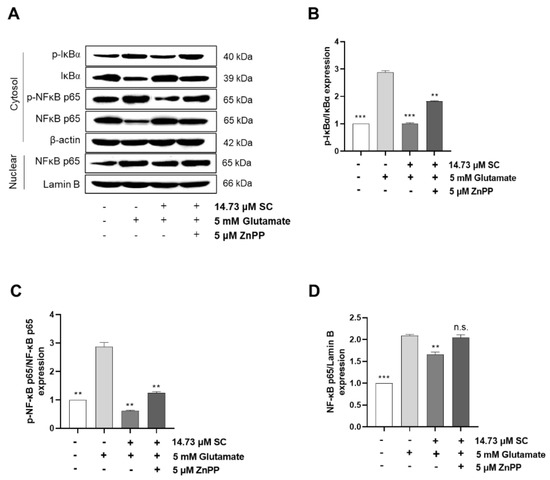 Effects of SC on the NF-κB signaling pathway in HT22 cells with HO-1 inhibited. Cells were treated with 5 μM ZnPP for 1 h with SC (14.73 µM) followed by 5 mM glutamate for 1 h. Subsequently, phosphorylation levels of IκBα (A,B) cytoplasmic NF-κB p65 (A,C), and nuclear NF-κB p65 (A,D) involved in the NF-κB signaling pathway were detected by Western blot assay. Values are expressed as the mean ± SE calculated from three replicates. The statistical symbols (** p < 0.01; *** p < 0.001; n.s., no significance) indicate significant differences from the glutamate-treated group.