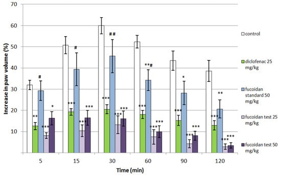 | fucoidan standard 50 mg/kg | Mean | 29.28 # | 39.34 # | 45.58 ## | 34.27 #** | 28.18 * | 20.65 ** |