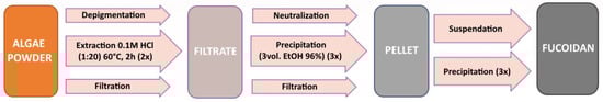 - Hahn, T.; Lang, S.; Ulber, R.; Muffler, K. Novel procedures for the extraction of fucoidan from brown algae. Process Biochem. 2012, 47, 1691–1698. [Google Scholar] [CrossRef]