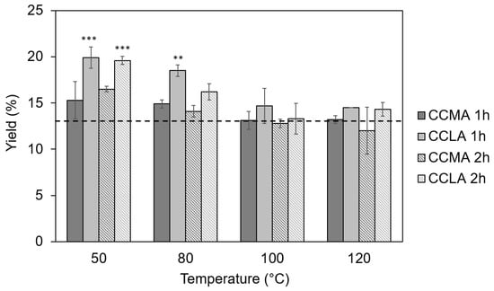Furthermore, the results showed that one hour of treatment resulted in systematically higher yields (Figure 1), which indicated an insufficient reaction time for the complete removal of the undesirable compounds. This was further confirmed by the elemental analysis as the samples with high yields (i.e., low extraction temperatures and short extraction times) showed the highest relative amounts of nitrogen (between 7.5 and 8.5% for the temperatures of 50 °C and 80 °C for both CCMA and CCLA extracts (Table 1, which is coherent with a protein excess, compared to the traditional extraction (6.4 ± 0.2%).