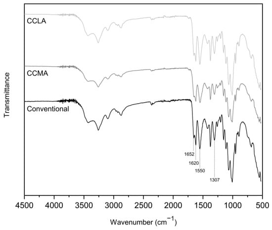 Theoretically, carbon/nitrogen ratio (C/N) varies from 5.15 in chitosan to 6.86 in chitin, the fully N-acetylated biopolymer []. The C/N ratios obtained by elemental analysis listed in Table 2 showed that the two samples were very close to that of the theoretical pure chitin were CCMA120-2 and CCLA120-2 with C/N ratios of 6.41 and 6.76, respectively. The degree of acetylation (DA) of these two samples were found to be 73.1% and 94.1% for CCMA120-2 and CCLA120-2, respectively. The DA of the chitin extracted by using the conventional approach was 84.8%. Based on these results, CCMA120-2 and CCLA120-2 were selected for further characterization, namely the chemical structure, morphology, and thermal properties.
