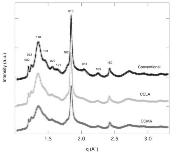 The WAXS spectra collected on the three samples (CCLA, CCMA, and conventional) displayed crystal reflections, corresponding to the α-chitin, according to the Minke and Blackwell model []. The major crystal reflections were 002, 012, 110, 101, 022, 121, 102, 013, 061 (Figure 3) that were also observed by Pacheco et al. []. The C.I. was determined from the peak, corresponding to the 110 reflection located at q = 1.35 Å−1 (Equation (3)). The C.I. were found to be 71.6% and 81.9% for CCMA and CCLA, respectively, which is in agreement with the DA results (i.e., CCLA presented higher DA). The C.I. of the conventional chitin was 80.6%, very close to CCLA values, and those by Férnández-Martin et al. [] (around 80.3%) and Salaberria et al. (around 79%) [].