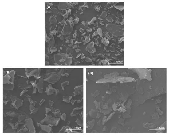 SEM pictures (×200) of chitin extracts by: (A) conventional approach; (B) CCLA120-2; and (C) CCMA 120-2.
