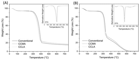 TGA and DTG profiles of the α-chitin extracts from conventional chitin, CCLA120-2 and CCMA120-2 chitin sample, in (A) nitrogen atmosphere and (B) air atmosphere.