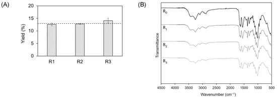 (A) Yields (dotted line represents CCLA120-2 yield (R0)); and (B) ATR-FTIR spectra of the CCLA120-2-based extracts in the different recycling cycles.
